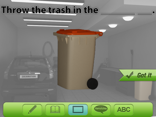 You can leave the scene as is, or click the “eye” at the bottom to switch to a black and white scene with only the target vocabulary remaining in color.